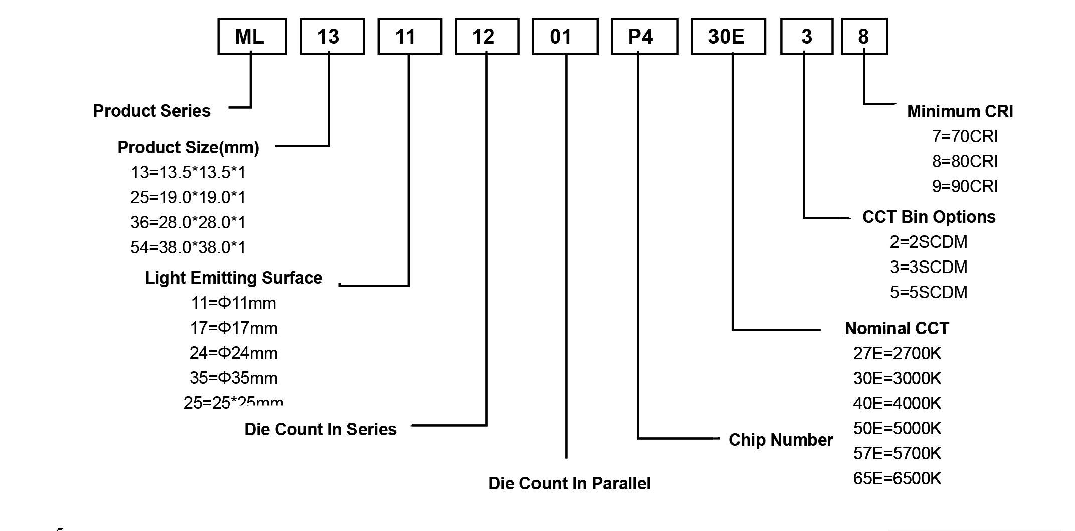 The part number designation for TYF ML Series LED arrays is explained as follows: